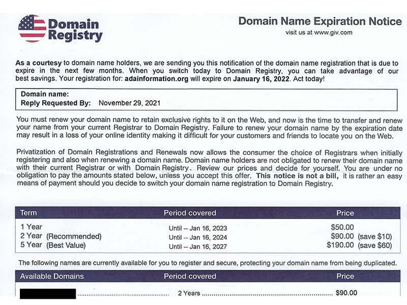Just A Minute! I Got A $300 Bill To Renew My Domain? Hi Reader, One of the most common scams I've seen lately is the "domain listing" or "domain renewal" scam. My clients are getting letters (yes, actual paper letters) in the mail demanding $200 - $300, with big, scary phrases like "DOMAIN NAME EXPIRATION NOTICE" in bold and all caps. (Here's a photo of one, in case you want to see it.) What's the deal with that? If you have a website, you're already paying for this... right? Yes, you are....