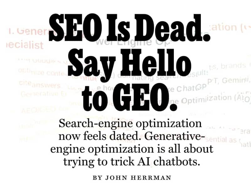 Just A Minute! SEO is Dead, Say Hello to GEO! Hi Reader, "A lie gets halfway around the world before the truth has a chance to get its pants on." - Mark Twain By now, I'm sure you've heard: "SEO is dead. It's all about AI now." I've heard it so many times it's making my head spin. But today, I saw something that really takes the cake: not only is this a topic of conversation around the office water cooler, but even major publications are getting in on it. From New York Magazine: SEO Is Dead....
